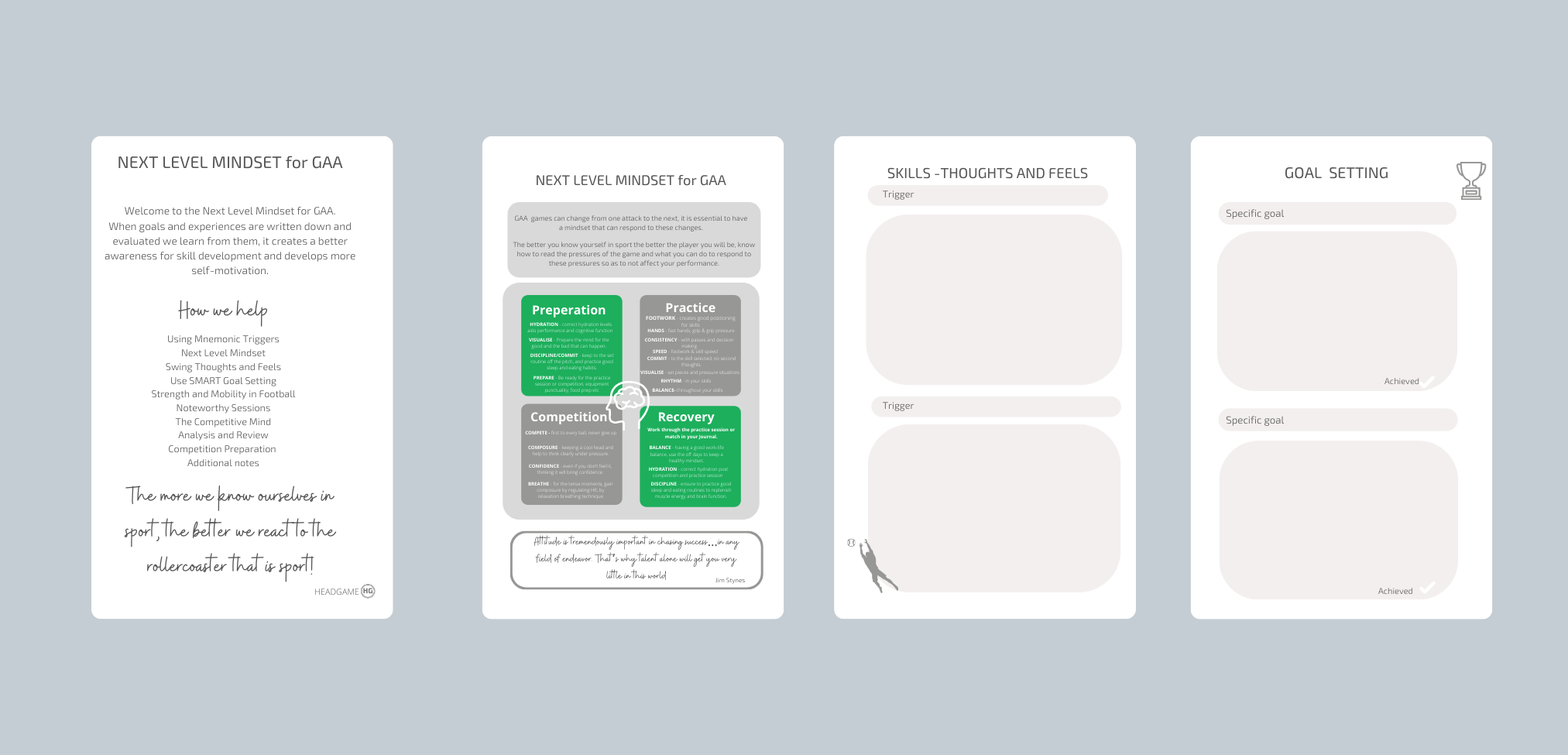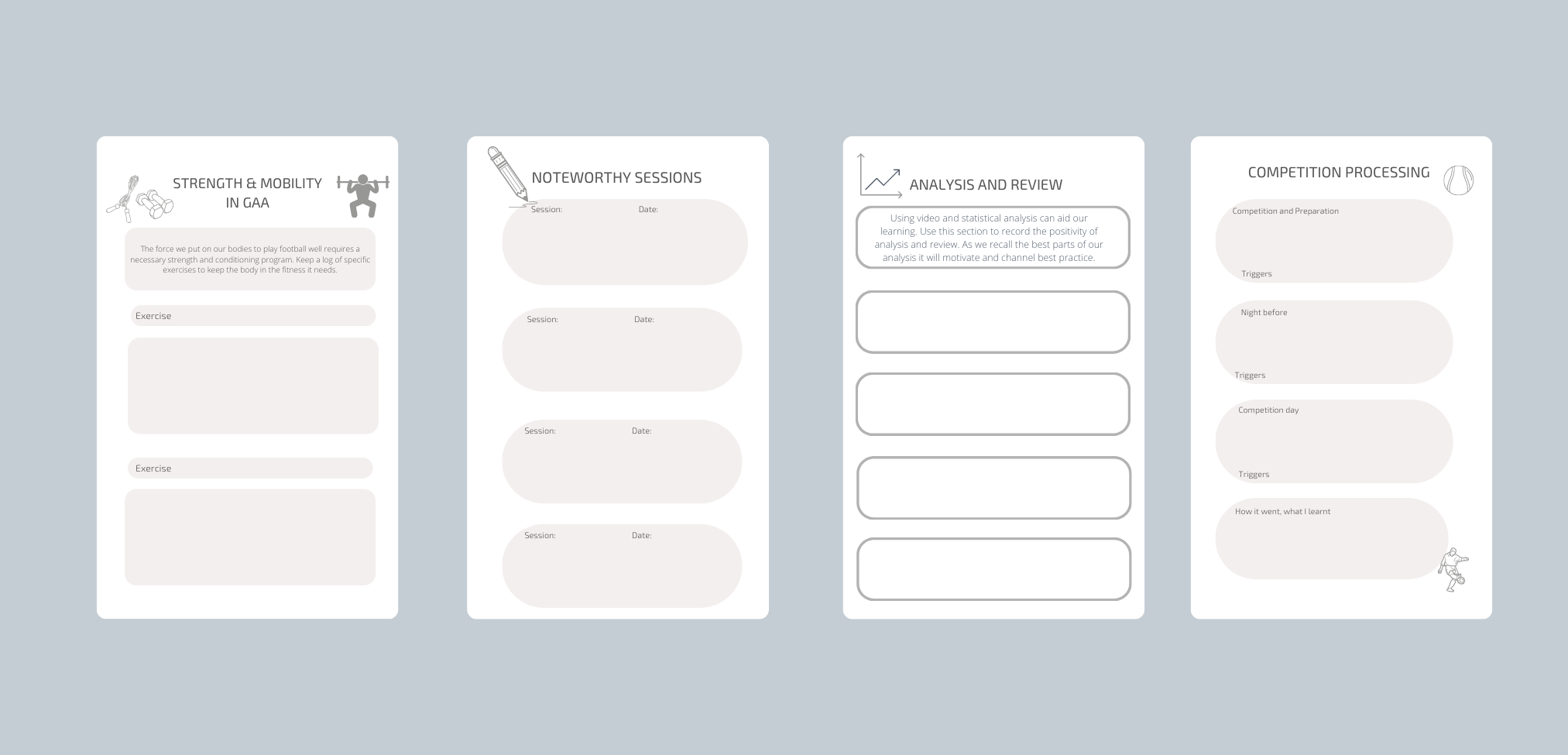 The perfect journal for any GAA player. Using Mnemonic Triggers, Next Level Mindset, Skill Thoughts and Feels, Use SMART Goal Setting, Strength and Mobility in GAA, Noteworthy Sessions, The Competitive Mind, Analysis and Review, Competition Preparation, Additional notes.