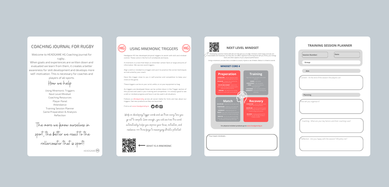 The perfect journal for any rugby player. Using Mnemonic Triggers, Next Level Mindset, Skill Thoughts and Feels, Use SMART Goal Setting, Strength and Mobility in Rugby, Noteworthy Sessions, The Competitive Mind, Analysis and Review, Competition Preparation, Additional notes.